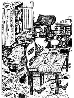 Он с шумом швырнул узел с вещами в угол и оглядел пещеру. Шкафы и сундуки были открыты, содержимое их валялось на полу. Все было перевернуто вверх дном: белье и кухонная утварь, домашний халат, кофейник, скамейка для стягивания сапог, коробка с фаброй для усов, принадлежности для ухода за обувью, спички, кочерга, каминные щипцы и доска для раскатывания теста, пара подтяжек, несколько пачек нюхательного табаку, печная вилка, спиртовые бутылки и еще добрая сотня других мелочей.
