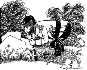 На следующее утро Хотценплотц выступил в поход, чтобы изловить Касперля и Сеппеля. На нем снова была форма полицейского — только на сей раз за поясом были заткнуты перцовый пистолет и семь ножей. В придачу к этому он имел при себе запасную подзорную трубу и несколько крепких веревок.