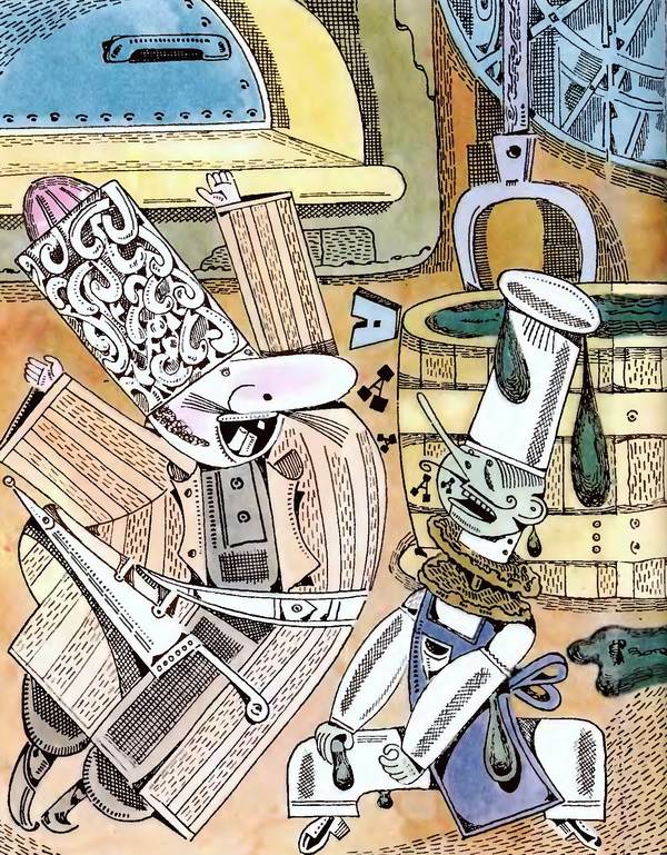 — Какой же это мёд! — закричал Бом Штекс. — Это дёготь. Вот мёд! — и он схватил вторую кадушку и поднял вверх. Но у него на глазах мёд внезапно превратился в дёготь. От неожиданности Бом Штекс пошатнулся, выпустил кадушку из рук, и дёготь полился ему на голову.