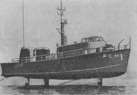 Так появились и сразу получили бурное развитие суда на подводных крыльях. Особенно большие успехи в этом, как известно, достигнуты в Советском Союзе. Строят суда на подводных крыльях и за рубежом. Иностранные специалисты попытались использовать этот принцип для создания специальных военных судов, и в частности малых морских противолодочных кораблей. Однако выход их на морские просторы, как сообщалось в зарубежной печати, потребовал решить проблему повышения устойчивости хода на морских и океанских волнах. Это осуществляется путем создания специальных крыльевых систем с автоматическим регулированием их угла атаки в зависимости от характера волны. Такими устройствами обеспечен, в частности, малый противолодочный корабль «Хай Пойнт» (рис. 11). Как сообщалось в печати, большие суда на подводных крыльях еще не созданы, самые крупные имеют водоизмещение не более 300 т. Однако эти суда прельщают специалистов своими высокими скоростными качествами. Скорость «Хай Пойнт», например, 40 узлов (около 75 км/час), а другого противолодочного корабля «Плэйнвью» — 60 узлов.