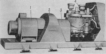 Существуют и другие схемы электростанций бесперебойного питания. Есть стационарные электростанции, где применяются электроагрегаты с обратимыми электрическими машинами и инерционным маховиком (рис. 18). Здесь, когда потребители электроэнергии могут питаться от внешней сети, электрическая машина 1 работает в режиме электродвигателя и вращает маховик 2. При этом электромагнитная муфта 3 разомкнута. Если же напряжение в сети исчезает, автоматически запускается дизель 4, и электрическая машина начинает работать в режиме генератора — давать ток. Инерционный маховик в этом случае выполняет роль накопителя кинетической энергии, которая используется для поддержания скорости вращения генератора в период пуска дизеля.