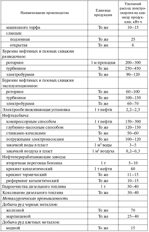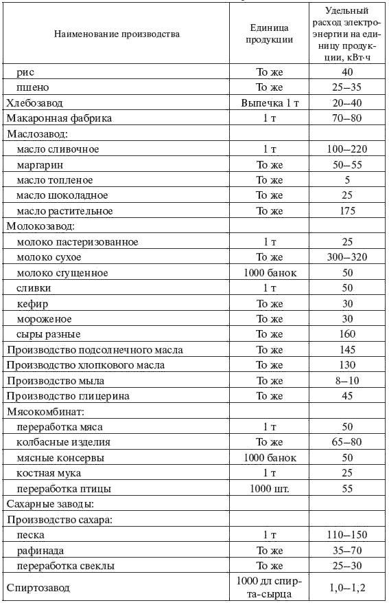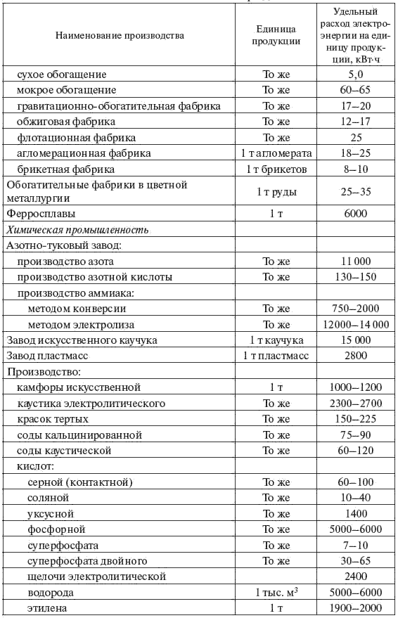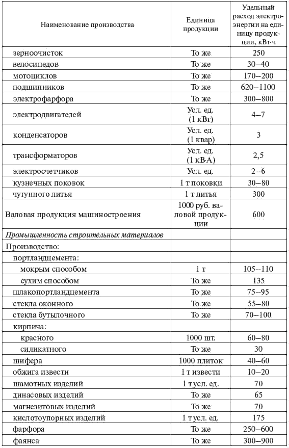 При отсутствии проектных проработок расход электроэнергии, потребляемой предприятием, Агод определяется на основании годового объема выпускаемой продукции М и удельных показатели расхода электроэнергии Ауд. В табл. 2.3 приведены ориентировочные показатели удельного расхода электроэнергии по видам продукции, составленные на основе обобщенных отчетных данных по промышленным предприятиям. Удельные показатели табл. 2.3 характеризуют уровень, достигнутый с помощью внедрения новых и совершенствования существующих технологических процессов, проведения в последнее время политики снижения расхода электроэнергии.