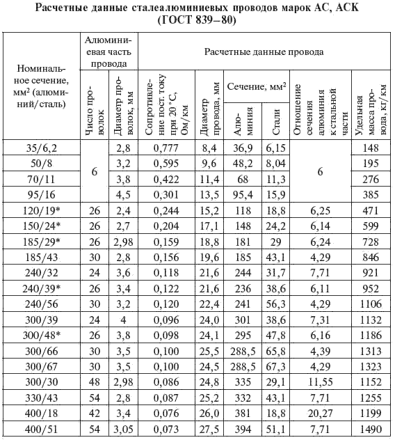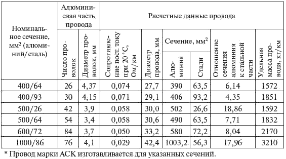 Расчетные данные сталеалюминиевых, алюминиевых и проводов из алюминиевых сплавов приведены в табл. 3.5 и 3.6.