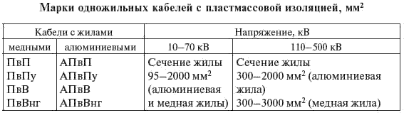 Основные типы силовых кабелей напряжением 6—10 кВ и выше приведены в табл. 3.23, стандартные сечения кабелей — в табл. 3.24— 3.26. Обозначения марок кабелей приведены ниже.