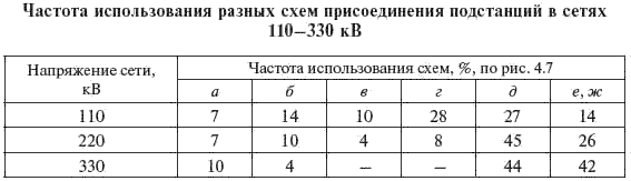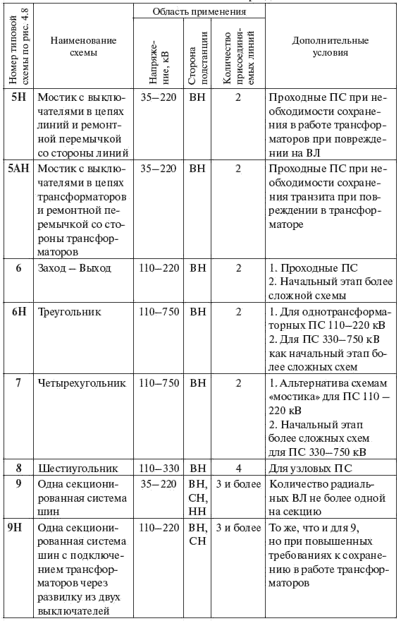 Схема 1 применяется в условиях загрязненной атмосферы, где целесообразна установка минимума коммутационной аппаратуры, или для ПС 330 кВ, питаемых по двум коротким ВЛ. Сдвоенная схема 3Н применяется вместо схемы 4Н в условиях стесненной площадки.
