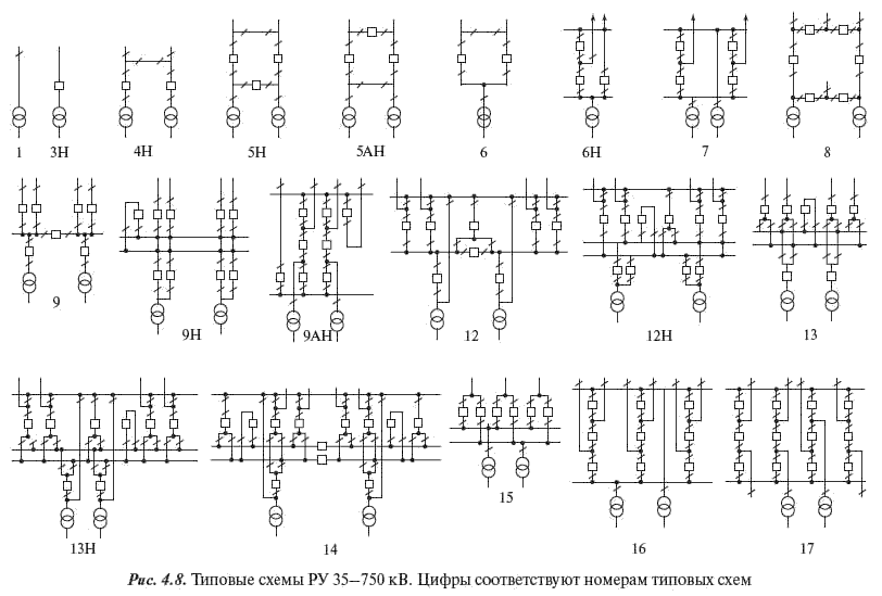 На рис. 4.8 приведены типовые схемы РУ 35-750 кВ, а в табл. 4.4 — перечень схем и области их применения. Типовые схемы РУ обозначаются двумя числами, указывающими напряжение сети и номер схемы (например, 110-5Н, 330-7 и т. п.). Номера схем не изменялись с первой редакции типовых схем; в дальнейшем некоторые схемы исключались из числа типовых.