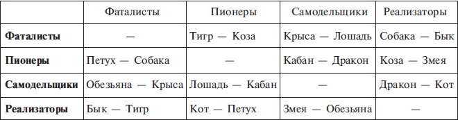 Дракон — Кабан. Дракон точно так же, как Коза и Тигр, лишен очевидных недостатков, поэтому его устремление к Кабану не идет по какой-то очевидной линии. Не случайно именно Дракон производит впечатление человека не от мира сего.