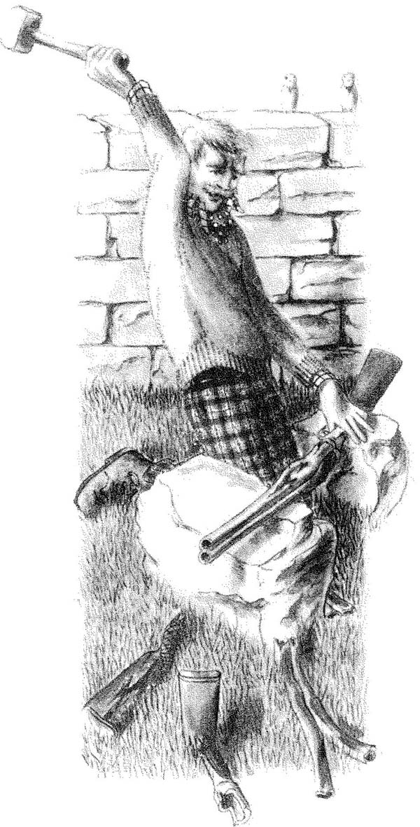 В одном углу сада мистер Грегг разбивал огромным молотом в мелкие кусочки три ружья.