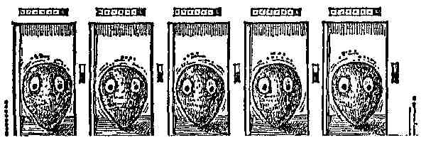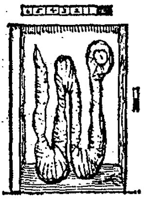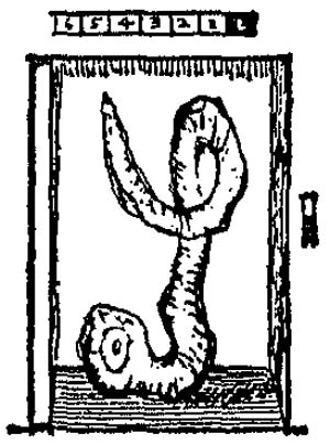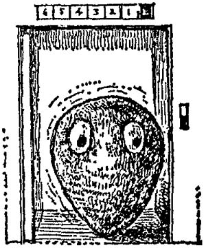 Бабушка Джозефина больше не вопила. Она застыла в шоке. Остальные, включая Чарли и дедушку Джо, сгрудились позади кровати. Они просто окаменели. Они не смели не только шевелиться, но и дышать. И даже мистер Уонка, который еще при первом вопле бабушки Джозефины быстро обернулся посмотреть в чем дело, был потрясен не меньше других. Широко открыв рот и выпучив глаза, он, как и все, неподвижно уставился на эту непонятную штуковину в лифте, которая выглядела примерно так (см. картинку).