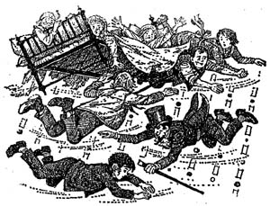 Тем временем трое стариков — дедушка Джордж, бабушка Джорджина и бабушка Джозефина — отчаянно и безуспешно старались забраться обратно в кровать. Каждый раз, когда кровать оказывалась под ними, они пытались улечься на нее, но она сейчас же снова уплывала из-под их спин. Глядя на это, Чарли и дедушка Джо буквально помирали со смеху.