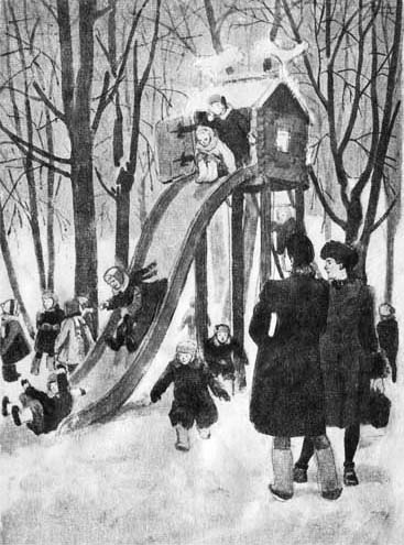 Оба детских сада сначала только смотрели друг на друга и молчали. Но вот Мая заговорила с незнакомой девочкой, потом Ваня — с незнакомым мальчиком, и скоро оба детских сада так перемешались, что невозможно стало различать, где одни, где другие. Дети катались с горки, бегали наперегонки, играли так дружно, будто познакомились уже много дней назад. Ваня сначала чуть не подрался со своим новым знакомым, которого звали Миша. Тот предложил попробовать, кто сильнее, и мальчики пробовали да пробовали, пока не рассердились. Но потом они успокоились, помирились и разговорились.
