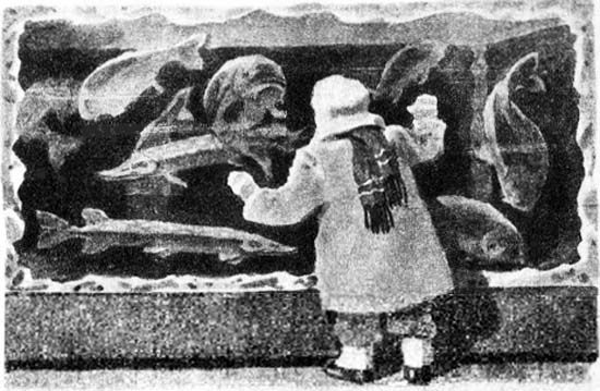 И что Никита Васильевич задумал, то и сделал. Построил он, например, огромный стеклянный аквариум, в котором плавали большие рыбы. Всякий, кто хотел, мог купить в магазине номер один живую рыбу. А кто не хотел — мог стоять и смотреть на живых рыб сколько вздумается.