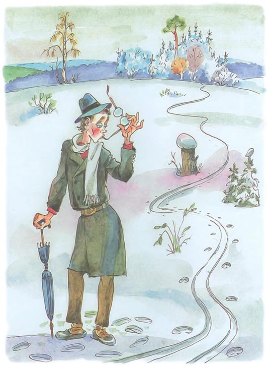 На стене часы у насПрозвонили восемь раз.В это время я проснулсяИ глаза открыл как раз.Я проснулся —И тотчас жеВ брюки сунул две ноги.Потянулся —И тотчас жеПрыгнул прямо в сапоги!А потом схватил рубашку,Сунул руки в рукава,Сунул голову в рубашку,Но застряла голова.Наконец надев рубашку,Я на улицу бегу,А тужурку и фуражкуНадеваю на ходу.