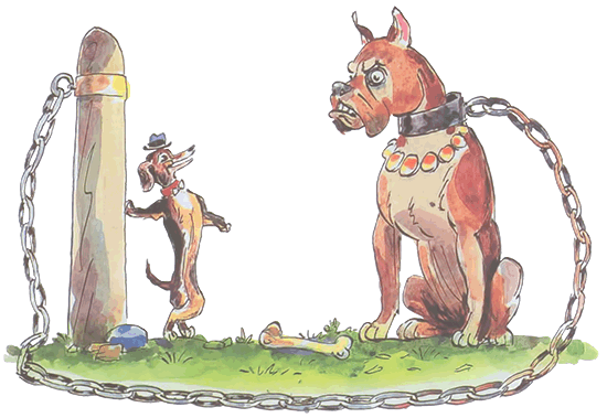 Над косточкой сидит бульдог,Привязанный к столбу.Подходит таксик маленький,С морщинками на лбу.«Послушайте, бульдог, бульдог!—Сказал незваный гость.—Позвольте мне, бульдог, бульдог,Докушать эту кость».Рычит бульдог на таксика:«Не дам вам ничего!»—Бежит бульдог за таксиком,А таксик от него.Бегут они вокруг столба.Как лев, бульдог рычит.И цепь стучит вокруг столба,Вокруг столба стучит.Теперь бульдогу косточкуНе взять уже никак.А таксик, взявши косточку,Сказал бульдогу так:«Пора мне на свидание,Уж восемь без пяти.Как поздно! До свидания!Сидите на цепи!»1939