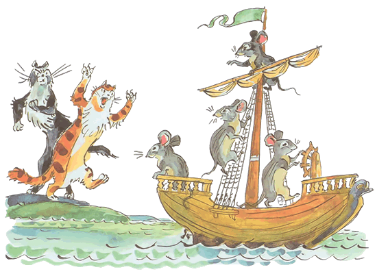 По реке плывёт кораблик,Он плывёт издалека.На кораблике четыреОчень храбрых моряка.У них ушки на макушке,У них длинные хвосты.И страшны им только кошки.Только кошки да коты!1940