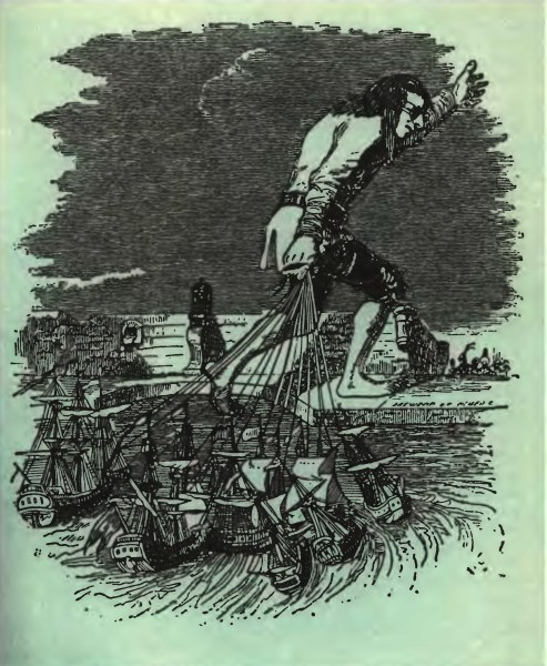Империя Блефуску есть остров, расположенный на северо-северо-восток от Лилипутии и отделенный от нее лишь проливом, шириною в восемьсот ярдов. Я еще не видел этого острова; узнав же о предполагаемом нашествии, старался не показываться в той части берега из опасения быть замеченным с кораблей неприятеля, который не имел никаких сведений о моем присутствии, так как во время войны всякие сношения между двумя империями были строго запрещены под страхом смертной казни и наш император наложил эмбарго на выход всех без исключения судов из гаваней. Я сообщил его величеству составленный мною план захвата всего неприятельского флота, который, как мы узнали от наших разведчиков, стоял на якоре, готовый поднять паруса при первом попутном ветре. Я осведомился у самых опытных моряков относительно глубины пролива, часто ими измерявшейся, и они сообщили мне, что при высокой воде глубина эта в средней части пролива равняется семидесяти глюмглеффам, — что составляет около шести европейских футов, — во всех же остальных местах она не превышает пятидесяти глюмглеффов. Я отправился на северо-восточный берег, расположенный напротив Блефуску, лег за бугорком и направил свою подзорную трубу на стоявший на якоре неприятельский флот, в котором насчитал до пятидесяти боевых кораблей и большое число транспортов. Возвратившись домой, я приказал (у меня было на то полномочие) доставить мне как можно больше самого крепкого каната и железных брусьев. Канат оказался толщиною в бечевку, а брусья величиной в нашу вязальную иголку. Чтобы придать этому канату большую прочность, я свил его втрое и с тою же целью скрутил вместе по три железных бруска, загнув их концы в виде крючков. Прикрепив пятьдесят таких крючков к такому же числу веревок, я возвратился на северо-восточный берег и, сняв с себя кафтан, башмаки и чулки, в кожаной куртке вошел в воду за полчаса до прилива. Сначала я быстро двинулся вброд, а у середины проплыл около тридцати ярдов, пока снова не почувствовал под собою дно; таким образом, меньше чем через полчаса я достиг флота. Увидев меня, неприятель пришел в такой ужас, что попрыгал с кораблей и поплыл к берегу, где его собралось не менее тридцати тысяч. Тогда, вынув свои снаряды и зацепив нос каждого корабля крючком, я связал все веревки в один узел. Во время этой работы неприятель осыпал меня тучей стрел, и многие из них вонзились мне в руки и лицо. Помимо ужасной боли, они сильно мешали моей работе. Больше всего я боялся за глаза и наверное лишился бы их, если бы не придумал тотчас же средства для защиты. Среди других необходимых мне мелочей у меня сохранились очки, которые я держал в секретном кармане, ускользнувшем, как я уже заметил выше, от внимания императорских досмотрщиков. Я надел эти очки и крепко привязал их. Вооружась таким образом, я смело продолжал работу, несмотря на стрелы неприятеля, которые хотя и попадали в стекла очков, но не причиняли им особого вреда. Когда все крючки были прилажены, я взял узел в руку и начал тащить; однако ни один из кораблей не тронулся с места, потому что все они крепко держались на якорях. Таким образом, мне оставалось совершить самую опасную часть моего предприятия. Я выпустил веревки и, оставя крючки в кораблях, смело обрезал ножом якорные канаты, причем более двухсот стрел угодило мне в лицо и руки. После этог