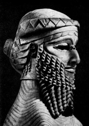 Эта поразительная по своему реализму бронзовая голова в три четверти натуральной величины найдена в Ниневии и хранится теперь в Иракском музее в Багдаде. Надпись, по которой можно было бы точно определить, чье это изображение, отсутствует. Скорее всего это скульптурный портрет одного из царей семитической династий, так называемой династии Аккада, правившей Шумером в XXIV–XXIII вв. до н. э.