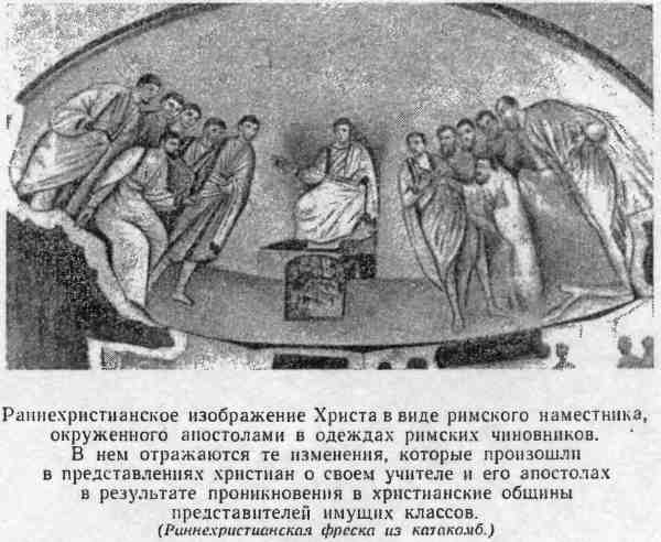 Христианский культ не возник, как это представляют богословы, сразу в виде откровения. Христиане долгое время оставались незначительной по своей численности сектой внутри иудейства, с которым их объединяли мессианские чаяния и эсхатология. Отсюда христиане позаимствовали и форму богослужения, и культ ангелов и архангелов, и демонологию, и праздники пасхи и пятидесятницы. В недрах уже христианской церкви заимствованные из иудейской религии элементы заполнились новым содержанием. Бог Саваоф ушел куда-то на задворки, а первое место фактически занял мессия — Иисус. Пасха превратилась в праздник воскресения, пятидесятница — в праздник троицы; ангелы обращены на службу Христу и его матери, а «священные» еврейские книги получили новое толкование, в мессианском духе.