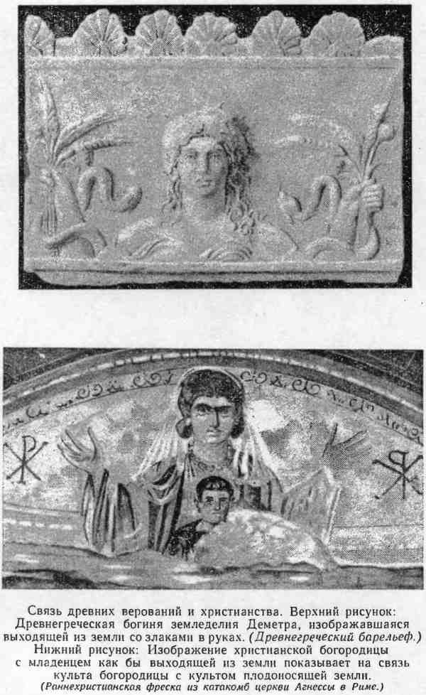 Когда христианские кадры стали вербоваться из язычников, приверженцев разного рода мистериальных культов, обряды этих последних были усвоены и христианами. Египетский праздник богоявления, мнтраистский праздник рождества спасителя, церемонии оплакивания, погребения и воскресения бога, целый ряд мелочей культа — все это вошло в обиход христианской церкви, как ее «исконное» достояние. Почитатели девственных богинь и богородиц — Кибелы, Астарты, Афродиты, Деметры и др. — прибавили к христианской троице четвертую богиню — Марию, вскоре занявшую едва ли не первое место в культе. Было бы совершенно невероятно, чтобы новообращенные христиане, вступая в новую общину, отказывались от своих культовых навыков и традиций.