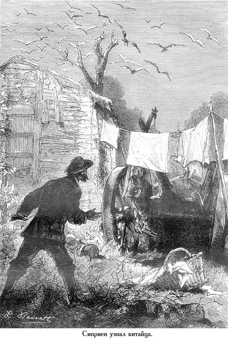 У Сиприена, оцепеневшего в первый момент, защемило сердце от жалости, когда он узнал китайца Ли, повешенного за шею меж небом и землей на собственной длинной косе. Молодой инженер, ни секунды не колеблясь, взобрался на дышло, обхватил руками тело несчастного, приподнял его, чтобы ослабить петлю, а затем перочинным ножом обрезать косу — все это заняло у него полминуты. Затем он осторожно соскользнул вниз и уложил свой груз в тени хижины.