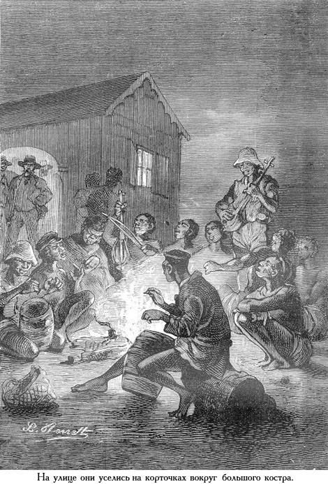 Но бедные негры вышли из дома еще до тоста, поднятого Джоном Уоткинсом, сразу же, как только отпала нужда в их службе. На улице они уселись на корточках вокруг большого костра на свежем воздухе и, оказав честь остаткам пиршественных мясных блюд, готовились к музицированию в той особой манере, которая принята в стране кафров. Гитары, сделанные из тыквы, флейты, в которые дуют через нос, всевозможные гремучие тамтамы [80] уже настраивались на ту оглушительную какофонию, которая предваряет любое крупное музыкальное действо южноафриканских туземцев.