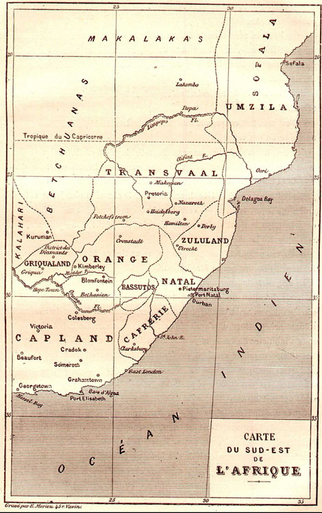 Трансвааль, который они собирались пересечь с юга на север,— обширная область Южной Африки, площадью самое малое в тридцать тысяч гектаров. Она простирается между Ваалем и Лимпопо к западу от Драконовых гор. Полностью колонизованный бурами, бывшими голландскими гражданами Капской области, число которых за пятнадцать — двадцать лет проживания там увеличилось более чем до ста тысяч, Трансвааль, естественно, оказался предметом вожделений Великобритании. И она в 1877 году присоединила его к своим капским владениям. Однако непрекращающиеся выступления буров, упорно стремящихся остаться независимыми, не дают пока оснований считать что судьба страны уже решена [82] .