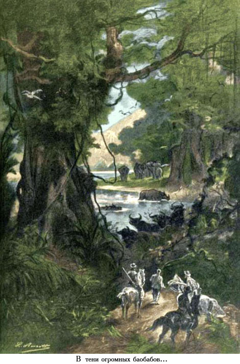 Первая из долин, незадолго до захода солнца открывшаяся взглядам троих путешественников, являла собой необыкновенно свежее и радостное зрелище. По саванне изумрудно-зеленого цвета протекала река, такая прозрачная, что в любом месте было видно ее дно. Склоны холмов, окружавших речную долину, покрывали плодовые деревья с самой разнообразной листвой. На этом фоне, пока еще освещенном солнцем, в тени огромных баобабов мирно паслись стада красных антилоп, зебр и буйволов. Немного дальше белый носорог своей тяжелой поступью шагал через широкую лужайку, неспешно продвигаясь к берегу, и уже радостно храпел, предвкушая, как всколыхнет речные воды своей мясистой тушей. Из лесной поросли слышался рык невидимого хищника, зевавшего от скуки. Ревел дикий осел, и целые стада обезьян гонялись друг за другом в кронах деревьев.