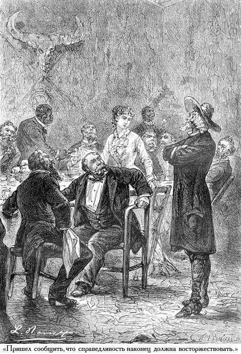 Дверь открылась. На пороге стояла длинная тощая фигура Якобуса Вандергаарта в ореоле седых волос. Гости переглянулись, весьма удивленные этим неожиданным явлением. В округе все слишком хорошо знали причины неприязни, разделявшей двух соседей, Джона Уоткинса и Якобуса Вандергаарта, и потому вокруг стола пробежал глухой ропот. Каждый ожидал чего-то очень важного. Воцарилась глубокая тишина. Глаза всех устремились на старого огранщика. А он, в торжественном сюртуке черного цвета, со скрещенными на груди руками, казался призраком, явившимся для мщения.