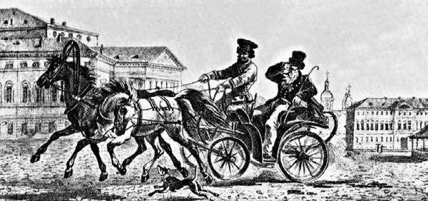 Щеголь в дрожках. Литография по рисунку А. О. Орловского. 1820 г. Слева здание Большого театра