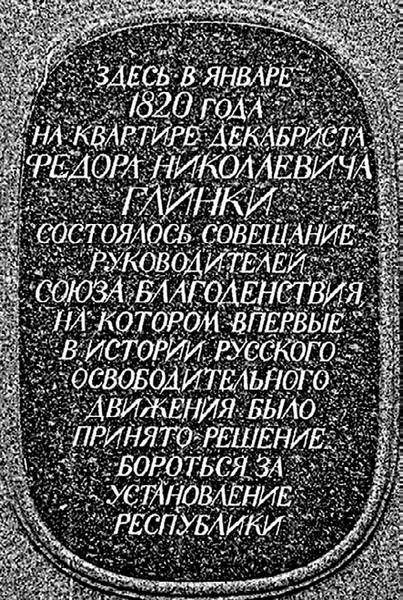 Мемориальная доска на доме № 16, в котором жил декабрист Ф. Н. Глинка