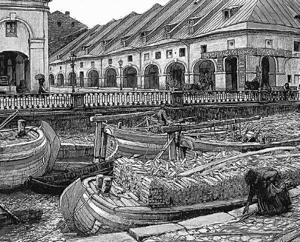Оживленная торговля проходила и непосредственно на баржах, шаландах и больших лодках, пришвартованных к стенкам Крюкова и Екатерининского каналов, доставивших в Петербург свежие продукты питания, гончарные изделия, строительные материалы и дрова.