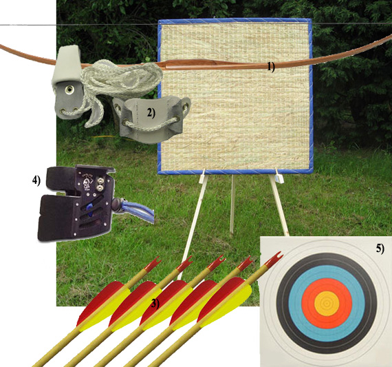 Стрельба из традиционного лука потребует лишь скромных вложений в снаряжение. На данном рисунке представлены: 1) традиционный лук, 2) шнурок–стрингер, 3) стрелы, 4) крага и 5) мишень.