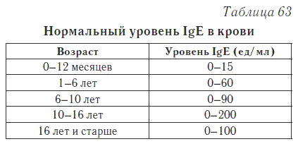 Нормальные показатели IgE в крови приведены в таблице 63.