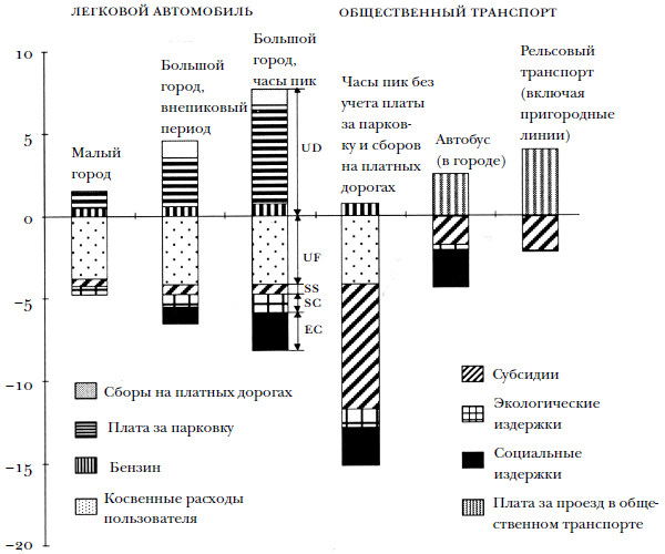 Прямые пользовательские издержки графически отложены выше горизонтальной оси с тем, чтобы выделить их как категорию, самым непосредственным образом влияющую на потребительский выбор вида транспорта. Четыре другие категории, на которые потребители не склонны обращать особого внимания при выборе способа передвижения, отложены ниже оси абсцисс.