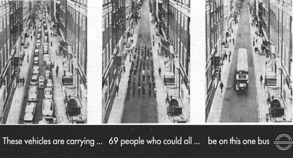 фотоиллюстрация 2.14. Сравнение уличного пространства, занимаемого 69 пассажирами, которые передвигаются на автомобилях и на автобусах. (©London Transport)