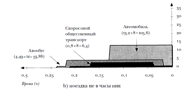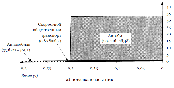 На рис. 2.3 показано, что поездка на автомобиле имеет меньшую продолжительность (в основном вследствие того, что она, по исходному предположению, совершается «от двери до двери»), однако в целом для автомобиля показатель «время-пространство» (графически обозначаемый площадью четырехугольника) гораздо выше, чем для автобуса или скоростного общественного транспорта. Разница в показателях времени и пространства, затраченных при поездках на различных видах транспорта, особенно велика в часы пик. Поэтому автомобилистам требуется больше всего дорожных ресурсов (пространства) именно в тот момент, когда на дороге находится максимальное количество транспортных средств.