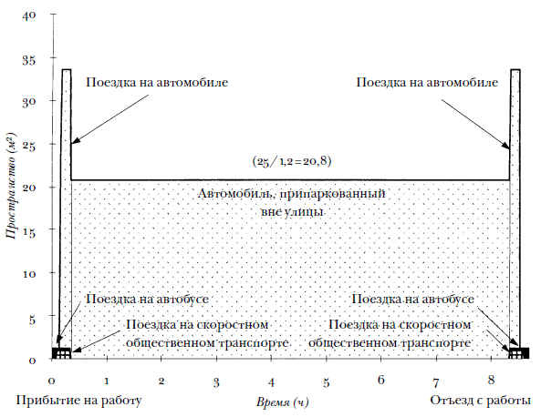 РИС. 2.3. «Время-пространство», потребляемое одним пассажиром во время 4-километровой поездки на работу и обратно – в вариантах использования трех разных видов транспорта.