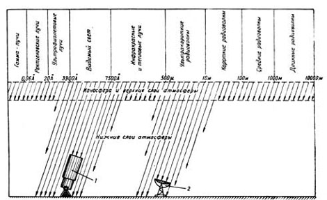 Для наблюдения за планетами и звездами удается использовать лишь небольшие участки электромагнитного спектра (рис. 3) — видимые световые лучи и ультракороткие радиоволны. На схеме видно, что только небольшая часть излучений достигает поверхности Земли. Остальные лучи, например ультрафиолетовые и инфракрасные, в значительной мере поглощаются атмосферой. Визуальному наблюдению небесных тел сильно мешают движение воздушных масс и колебания неравномерно нагретых плотных слоев воздуха, а также рассеивающая и отражательная способность атмосферы.