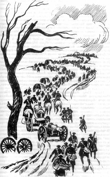 По напряженной спине царя было видно, что идти ему трудно. Минуту-другую необычно высокая фигура царя выделялась в сером колышущемся людском потоке, но, по мере того как Петр уходил дальше и дальше, серое однообразие стерло это отличие и царь затерялся в рядах солдат.