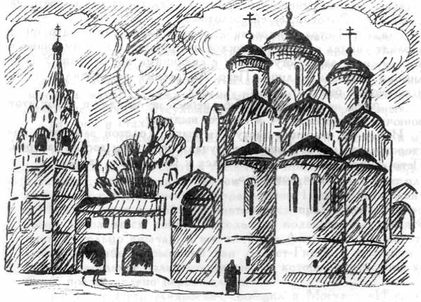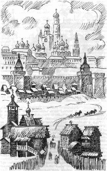 Открывавшаяся в эту минуту с заставы Москва была еще затенена синей рассветной дымкой. Однако, теснясь одна на другую, накатывались на заставу опушенные ночным свежим снежком крыши бесчисленных домов, и тут и там меж ними видны были вздымающиеся к небу купола церквей, посвечивающие золочеными крестами, и дымы, дымы поднимались над крышами, как странные, причудливые, несказанной красоты цветы. Стоящий на дороге на коленях человек очарованно смотрел на просыпающийся город, по щекам его ползли слезы.