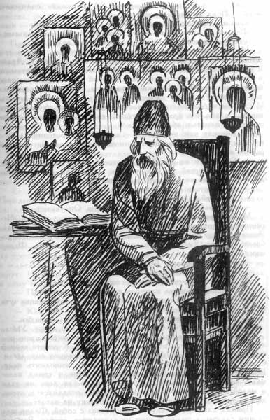 Сам стоит, смотрит. Черемной стукнул в дверь. Ему ответили. Он шагнул через порог. Под мерцающей лампадой Черемной увидел седого старца. Тот прищурился, поглядел на него внимательно из-под седых же бровей. Не вставая с кресла, спросил смиренно: