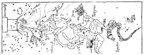 Рис. 65. Созвездие Змееносца, попирающего ногою смерть (Скорпиона), и созвездие Геркулеса, попирающего Дракона и пасущего змей (его детей) железной дубиной. Утренняя звезда, Венера. находилась 30 сентября 395 года в правой пятке Змееносца и показана в ней тёмным кружком.