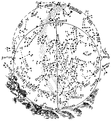 В зените находилась Лира, а к северу от неё Дракон и за ним Небесный Полюс, украшенный Полярной Звездой, центр вращения небесного свода, с 24 лучеобразно исходящими от него часами звёздного времени (так называемые часы прямого восхождения звёзд). Направо от него видны семь светочей Большой Медведицы, а налево – Кассиопея, называвшаяся прежде Троном.