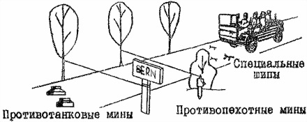 Для установки невзрывных заграждений на дорогах необходимо использовать спиленные деревья. При этом целесообразно использовать не слишком крупные деревья, с тем, чтобы противнику пришлось больше затратить времени и усилий на расчистку маршрута. В завалы можно установить мины-ловушки, а при отсутствии последних необходимо имитировать их установку полузамаскированными кусками проволоки, плохо прикрытыми дерном воронками, вскопанными или развороченными участками дорог (схема 16).