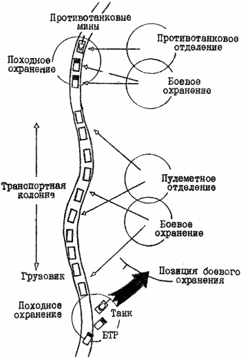 — в голове, на удалении 200-300 м, — охранение (танк и один-два бронетранспортера);