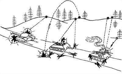 — огневые задачи (пулеметы, минометы и безоткатные орудия огонь всегда ведут по центру колонны; минометы — по остановившейся колонне);