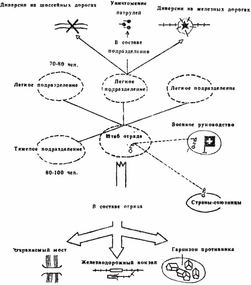 Взвод подрывников (численность 15-20 человек) оснащен карабинами, автоматами, автоматическими винтовками, взрывчатыми веществами и зажигательными средствами.