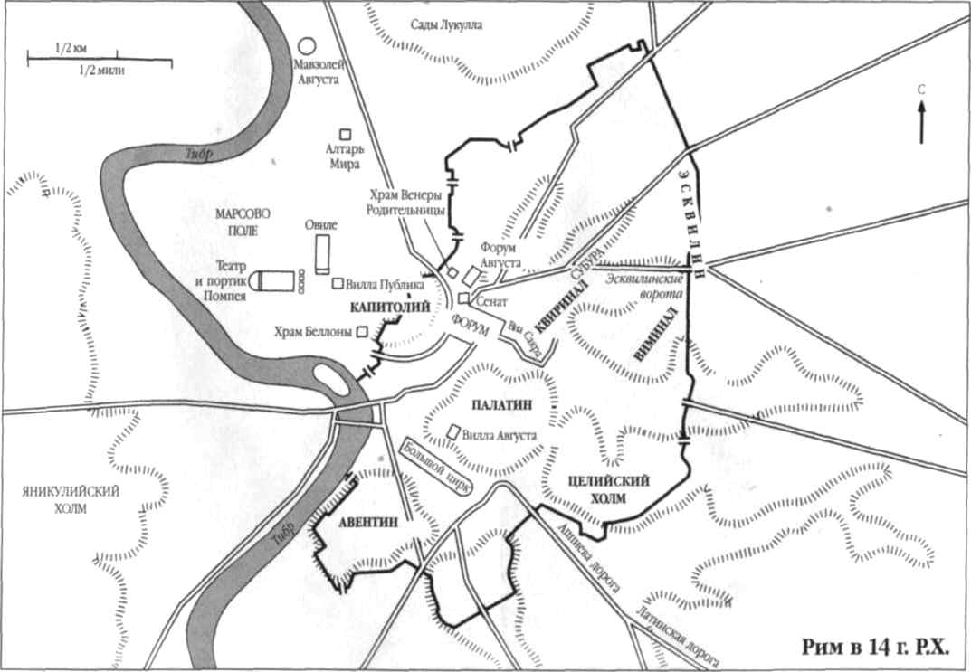 Август скончался летом 14 года после Р.Х. в Ноле — том самом городе, от стен которого столетием раньше Сулла начал свой судьбоносный поход на Рим. В ту же ночь — во избежание тления — сенаторы доставили его тело в столицу и, как и некогда Суллу, сожгли на огромном костре посреди Марсова поля. Старый диктатор — если дух его до сих пор скитался по этой равнине, — нашел бы, что обстановка самым драматическим образом изменилась по сравнению с той, которую он знал при жизни. С почестями перенесенный из дымящихся остатков костра пепел Цезаря Августа был помещен в мавзолей. Сооружение это было настолько огромным, что даже включало общественный парк; утверждали, что на масштаб его и округлую форму вдохновила создателей гробница Александра Великого. Марсово поле, некогда служившее местом упражнений римской молодежи, теперь превратилось в огромную витрину для демонстрации добродетелей принцепса. Его великодушия — ибо на юге, как и прежде, располагался театр Помпея: имя и трофеи врага Цезаря был сохранены по милости сына Цезаря. Его доброты — ибо там, где некогда граждане Республики собирались, чтобы потренироваться с оружием и отправиться на войну, ныне располагался Алтарь Мира. Его благотворительности — ибо сверкающие портики, протянувшиеся на целую милю — что превосходило в длину театр Помпея, — сделались после завершения строительства в 26 году до Р.Х. основной ареной развлечений, на которой Август ставил наиболее пышные среди спектаклей, разыгрывавшихся в городе. Официально это место оставалось Овиле, залом для голосования, экстравагантным образом преображенным из прежних деревянных загородок в мрамор. Однако теперь здесь редко голосовали. Там, где римский народ прежде собирался, чтобы избрать своих магистратов, ныне сражались гладиаторы и демонстрировались различные чудища — например змеи длиной почти в девяносто футов. [305] А когда здесь ничего не выставлялось, граждане могли собраться около модных лавок.