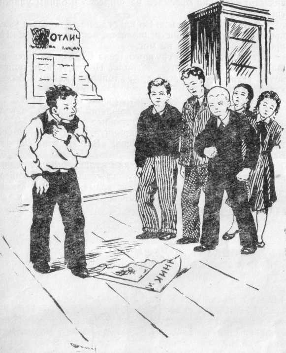 Ребята, переговариваясь и пересмеиваясь, стенкой окружили газету. Никто не заметил, как сзади подошёл Фирсов. Высокий и сильный, он одной рукой раздвинул «стенку» и долго и внимательно рассматривал рисунок.