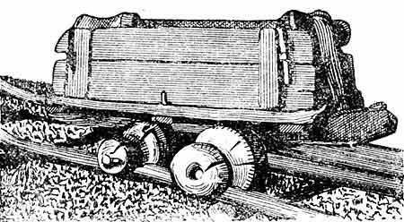 Деревянная рельсовая дорога и повозка, применявшиеся в рудниках в XVI веке.